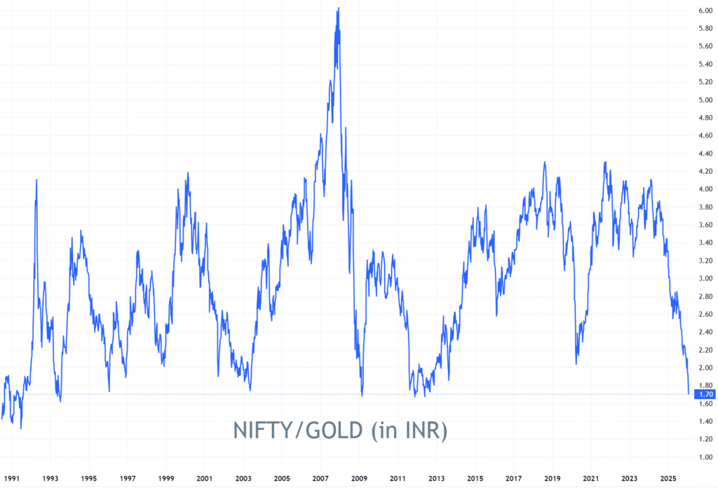 - Accept that “cheap” can get cheaper. If Nifty is at 1.7x Gold, it doesn’t mean it can’t go to 1.5x.